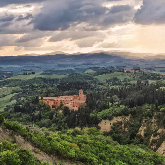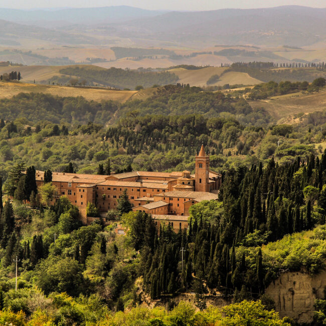 The Abbey is still inhabited by the Olivetan monks, guardians of an ancient tradition. By visiting it, you can immerse yourself in the peace of the wonderful church, admire the large cloister decorated with the famous cycle of frescoes depicting the stories of Saint Benedict, a masterpiece begun by Luca Signorelli and completed by Antonio Bazzi, known as the Sodoma. You will also discover the refectory, where silence echoes with prayers and reflections, the library, which has preserved treasures of knowledge for centuries, the precious pharmacy, with its typical containers, and a small museum, surprisingly rich, that will reveal more wonders. Finally, you can visit a wine cellar, where you will uncover an ancient herbal recipe and the authentic flavors of wines and other products from the farm.