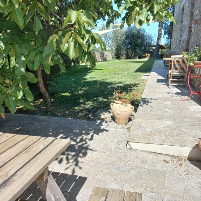 Dagli appartamenti è possibile accedere alla corte esterna dove poter pranzare all'aperto, dove è presente il barbecue a disposizione dei nostri clienti. Il fabbricato è circondato da un ampio giardino, con parcheggio esclusivo, zone destinate al relax e piscina. A disposizione dei clienti abbiamo inoltre arredi da giardino, sdraio e lettini per poter trascorrere veri momenti di pace in perfetta tranquillità e lontano da occhi indiscreti.Sistemazioni