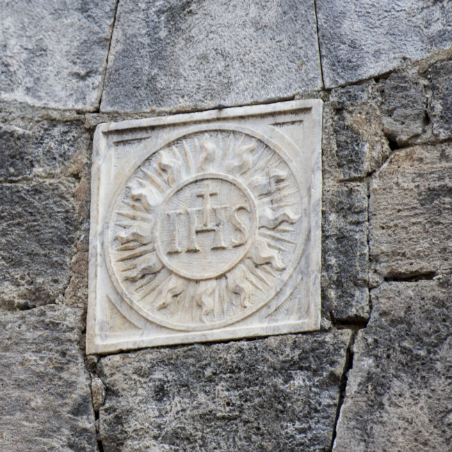 In origine dedicata a San Giovanni, la chiesa ha assunto l'intitolazione attuale grazie alla compagnia laicale che la prese sotto la propria protezione alla fine del Settecento. Entrando al suo interno, si poteva ammirare una preziosa tavoletta del monogramma del “Nome di Gesù”, oggi custodita nel Museo di Palazzo Corboli, che fu probabilmente realizzata dallo stesso San Bernardino per i suoi celebri sermoni. Tale monogramma, con le tre lettere "IHS" compare anche in un bassorilievo in pietra, posizionato sulla facciata della chiesa.