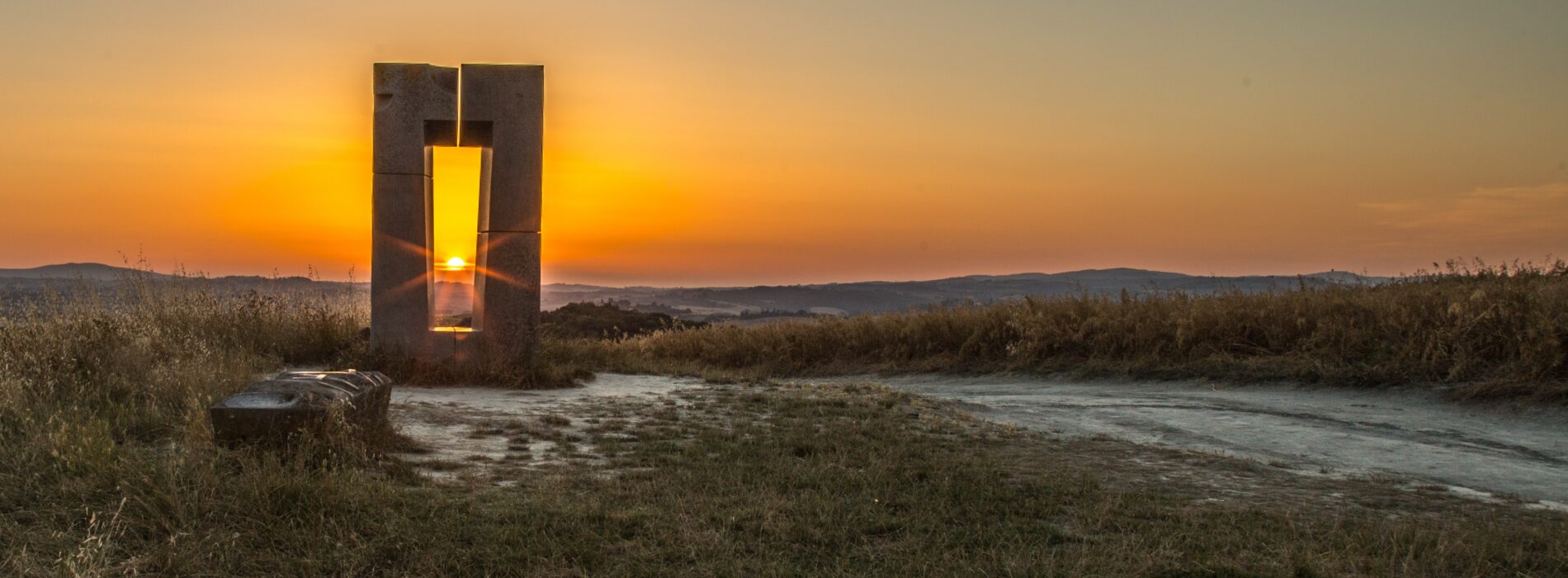 Passeggiata al tramonto nel geosito delle Biancane di Leonina, alla scoperta del territorio delle Crete Senesi e delle sue meraviglie edell'opera di Jean-Paul Philippe "Site Transitoire", una scultura di arte contemporanea che si fonde perfettamente con il paesaggio circostante.
