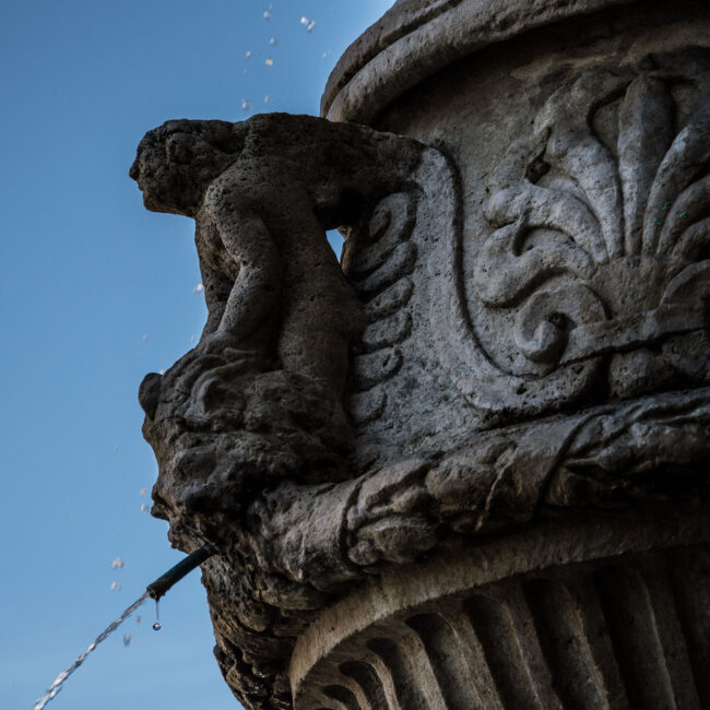 Questa candida fontana è opera dello scultore Antonio Ghini, che la realizzò negli anni '70 del XV secolo. Osservandola dall'alto, la vasca si rivela nella sua elegante forma a quadrilobo, una cornice tipica dell'arte gotica e rinascimentale, composta da quattro semicerchi disposti a croce, che richiamano l'immagine di un quadrifoglio. Al centro, la brocca maestosa cattura l'attenzione con quattro altorilievi di teste di leone sormontate da figure alate, simboli di potenza e spiritualità. I bassorilievi che decorano la brocca riproducono dei motivi vegetali, conferendo un senso di equilibrio e armonia.