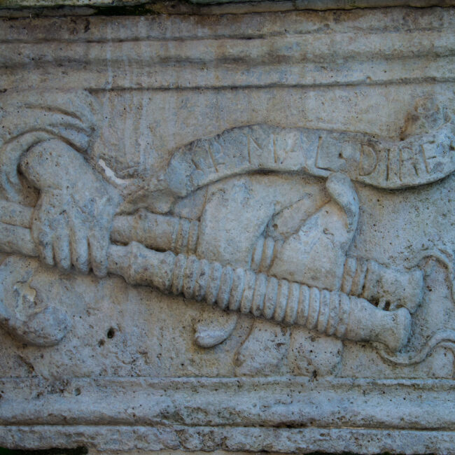 La brocca e l'elemento triangolare sono sostenuti da tre sculture raffiguranti granchi, che emergono appena sopra il livello dell'acqua della vasca, simboleggiando forse la tenacia e la protezione.