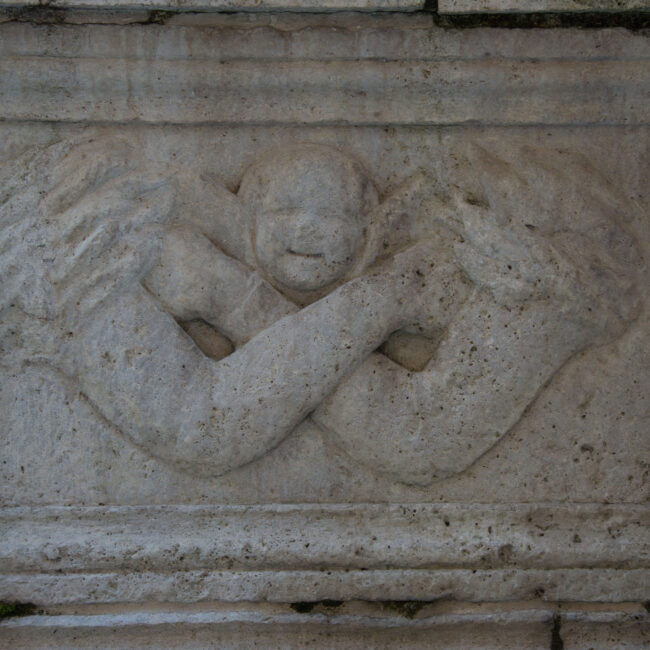 Altri simboli sono scolpiti sulla vasca: due braccia incrociate, forse emblema di concordia; due lingue strozzate tra bastoni ornati, con la scritta "maldire", un monito contro la maldicenza; una cornucopia, simbolo dell'abbondanza, e una chiocciola, che rappresenta la costanza. Uno dei dettagli più intriganti è forse il medaglione con la testa di una giovane donna, che alcuni studiosi identificano come Francesca Benassai, figlia di Bartolomeo Benassai, incaricato dalla Repubblica di Siena di sovrintendere alla costruzione della fontana.