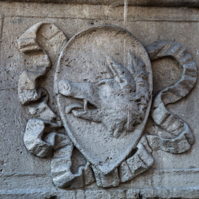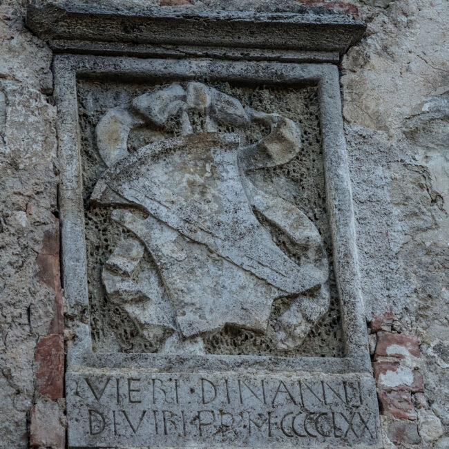 Al di sotto, un elemento triangolare reca tre stemmi. E’ scolpito quello della famiglia di Vieri di Nanni, Podestà di Asciano, con i suoi tre spadini, e possiamo ammirare anche una delle prime rappresentazioni dello stemma civico di Asciano: una zampa di leone che stringe un'ascia. La fontana stessa è un'opera commissionata dalla Repubblica di Siena, rappresentata nel 1471 da Andrea Capacci, il Camerlengo, con stemma caratterizzato da una testa di cinghiale.