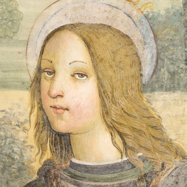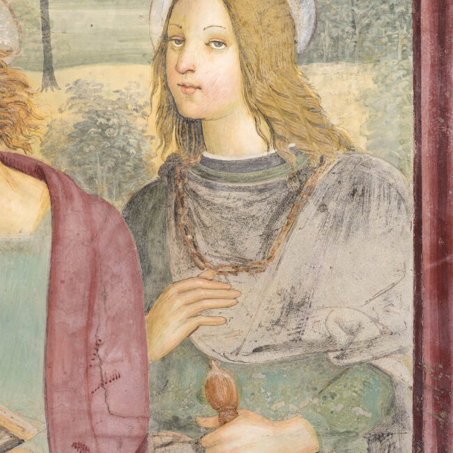 Secondo lo storico dell’arte Divo Savelli l’affresco sarebbe attribuibile alla scuola umbra, e nello specifico alla bottega di Pinturicchio, e riconoscerebbe, nel volto di S.Cassiano, i lineamenti del giovane Raffaello, che dunque potrebbe aver realizzato qui il suo autoritratto.