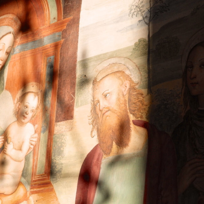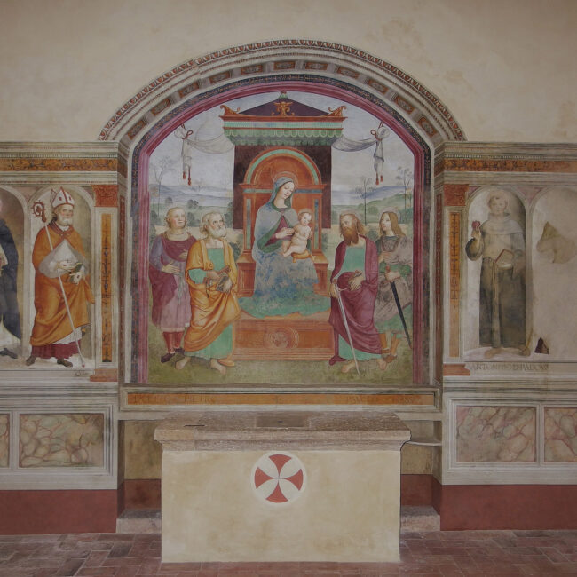All’interno è presente un unico altare sormontato da una nicchia affrescata e centinata. Il soggetto dell’opera è una Sacra Conversazione, composta dalla Madonna in Trono col Bambino e i Santi Pietro, Paolo, Ippolito e Cassiano. Ai lati dell’immagine centrale, l’affresco continua con finte nicchie nella quali si trovano, a sinistra le figure di S. Domenico e S. Agostino, a destra S. Antonio da Padova e un ultimo personaggio che in seguito fu occultato da un finto tendaggio.